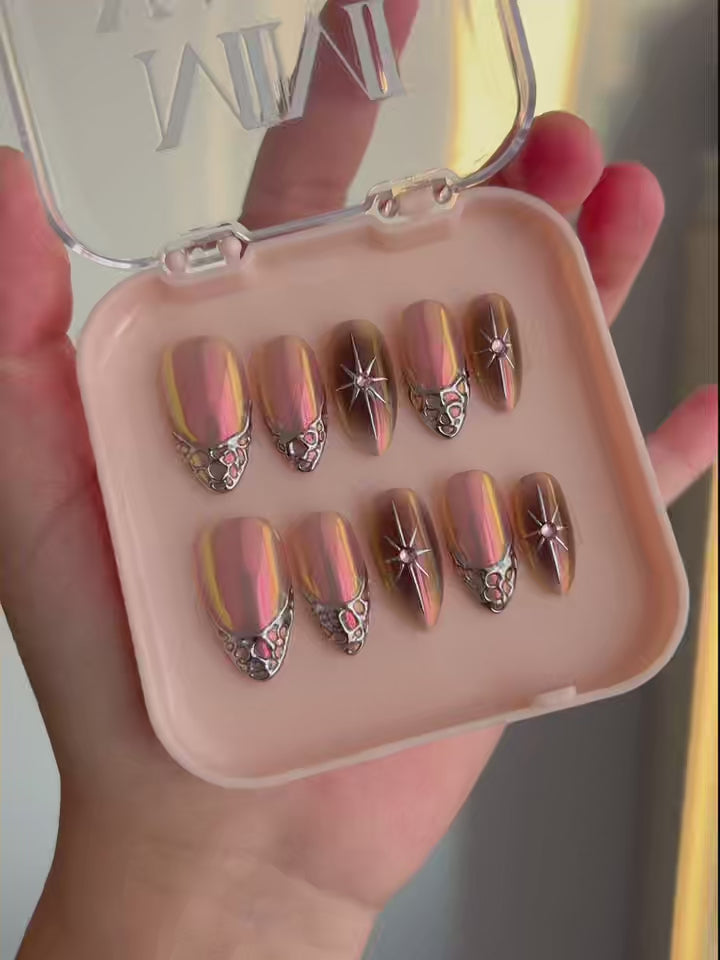 Aurora Relic is a bold, futuristic press-on nail set inspired by metallic artifacts and celestial light.