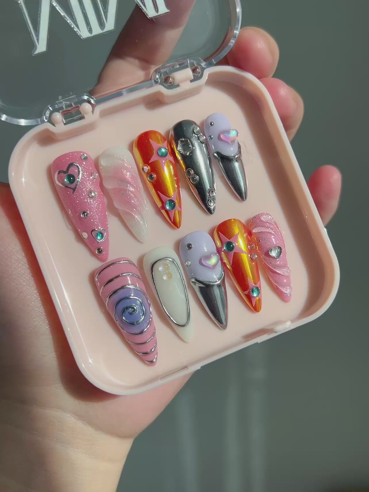 This press-on nail set captures the iconic spirit of the Y2K era with metallic chrome accents, swirling lines, candy-hued gradients, and 3D embellishments, as if you’re dancing at a cosmic disco.