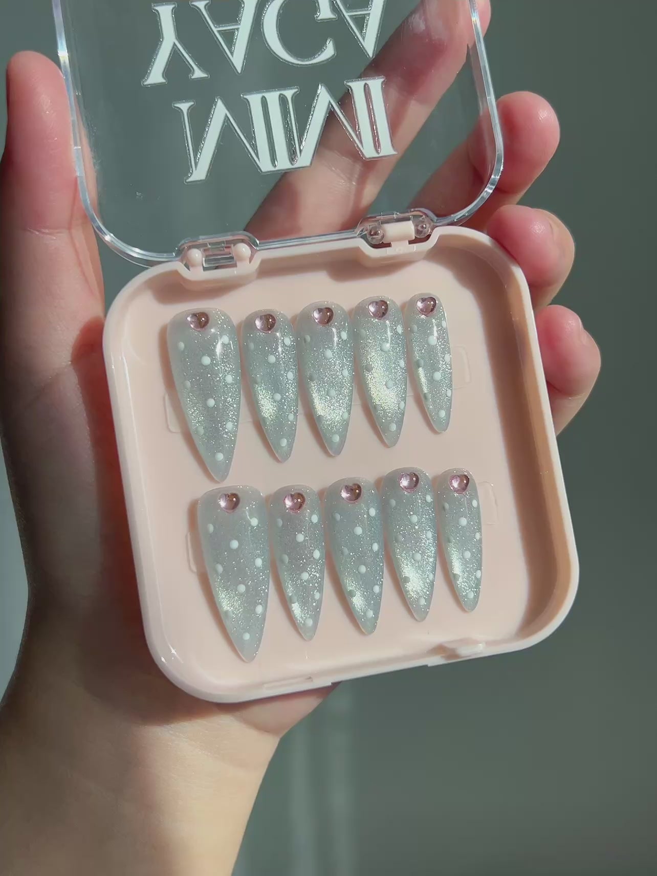 Glacier Heart captures the beauty of icy elegance — a shimmering silver press on nail set kissed with delicate white dots and a sweet pink heart gem on each fingertip.
